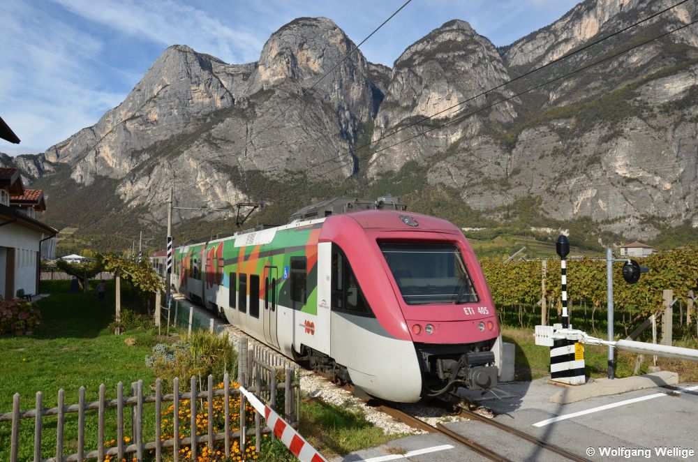 ETi 405 der Trentino Transporti fährt am 27. Oktober 2011 zwischen Mezzolombardo und Masi di Vigo Richtung Marilleva