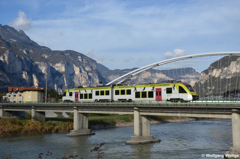ETi 408 der Trentino Transporti überquert am 27. Oktober 2011 bei Grumo San Michele den Fluss Eisack