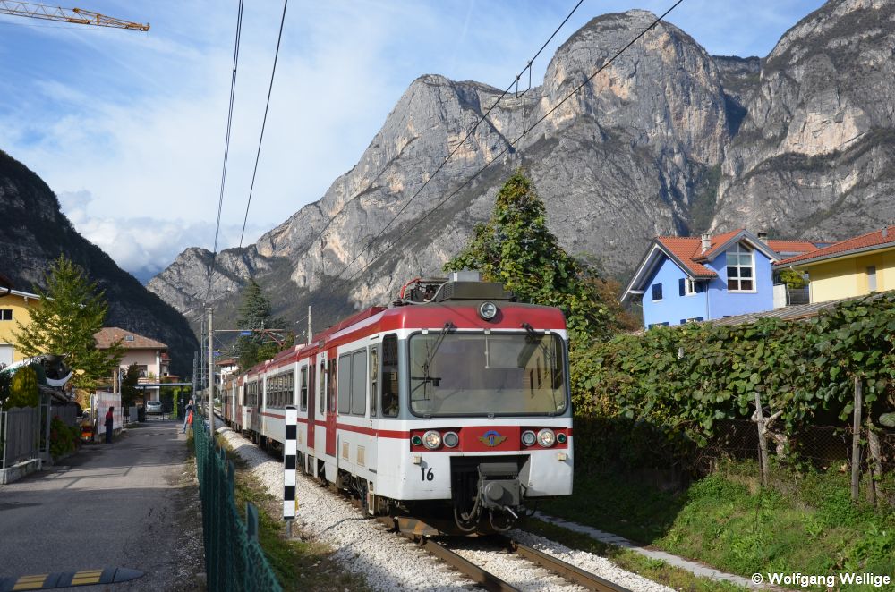 Triebwagen 16 der Schmalspurbahn Trento - Male erreicht von Marilleva kommend gleich den Bahnhof Mezzolombardo (27.10.2011)