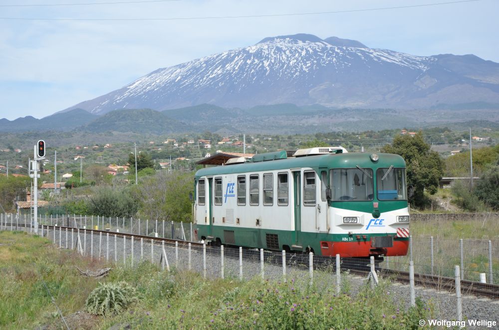 Triebwagen ADE 19 der Ferrovia Circumetnea auf Sizilien mit dem namensgebenden Berg, dem Vulkan Ätna im Hintergrund, aufgenommen am 14. April 2016 als Zug 33 von Catania kurz vor seinem Endbahnhof Adrano Nord.