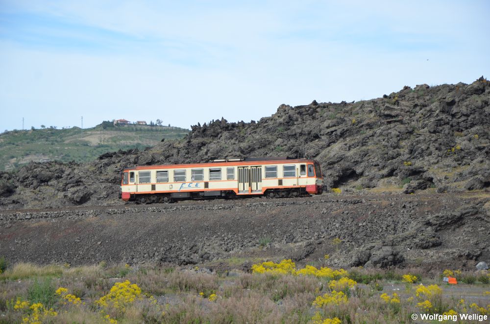 Die Schmalspurbahn rund um den Ätna fährt durch zum Teil surreal anmutende Landschaften, die durch das Vulkangestein entstanden sind. Ein Beispiel dafür ist dieser Streckenabschnitt bei Bronte, den ADE 23 am 14.04.2016 passiert.