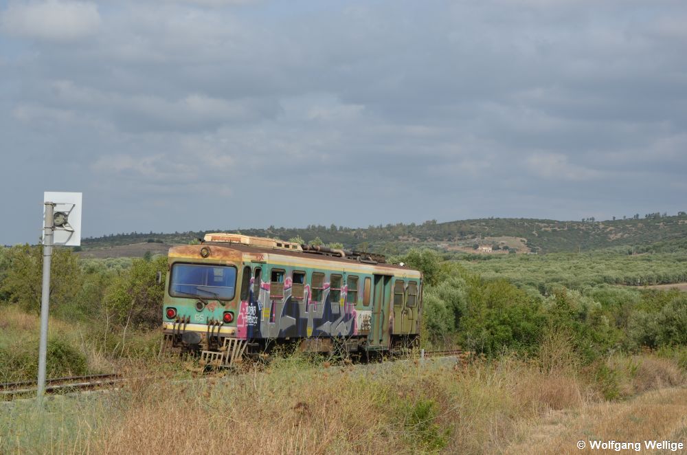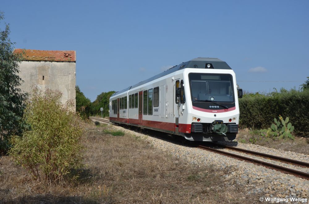 Ab 2015 wurden für den sardischen Schmalspurbahnbetreiber ARST insgesamt neun neue Dieseltriebwagen von der schweizer Firma Stadler gebaut. Am 19. September 2019 erreicht ADeS 08 als Zug AT 770 von Olmedo in wenigen Minuten seinen Endbahnhof Alghero.