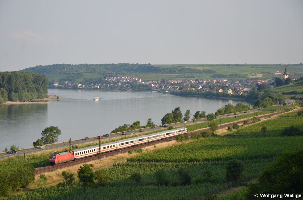 Auf der linken Rheinstrecke fährt die passenderweise mit einer 'Rheingold'-Beklebung versehene 101 112 am 24. Juni 2017 mit EC 6 (Interlaken Ost - Dortmund Hbf) durch das Städtchen Oberwesel mit seiner mittelalterlichen Stadtbefestigung