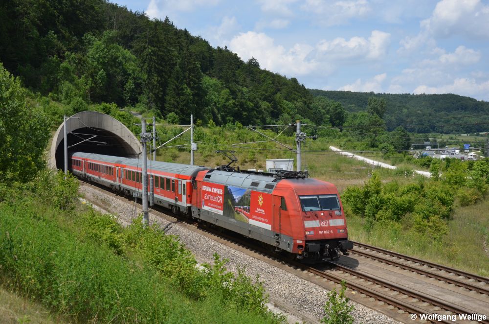 Die mit Werbung für den Bernina-Express in der Schweiz versehene 101 092 befährt am 19. Juni 2014 mit dem 'München-Nürnberg-Express' RE 4021 die Schnellfahrstrecke Nürnberg - Ingolstadt bei Kinding.