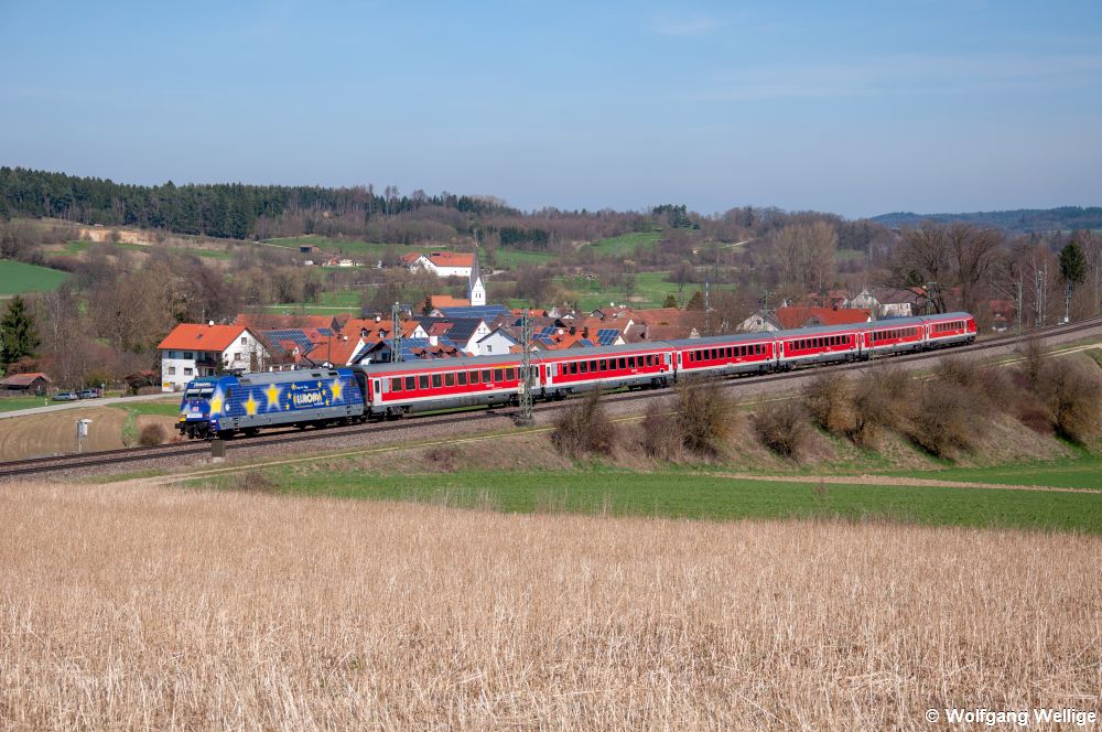 Die mit einer Beklebung 'Zug um Zug Europa verbinden' versehene 101 101 zieht am 2. April 2011 den 'München-Nürnberg-Express' RE 4007 von Nürnberg Hbf nach München Hbf bei Paindorf
