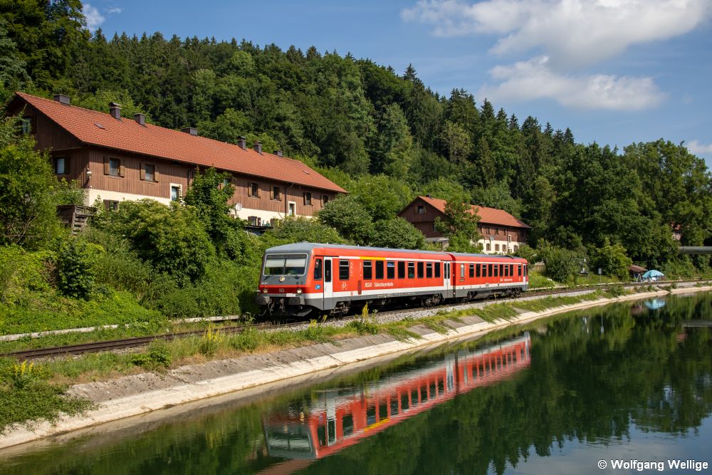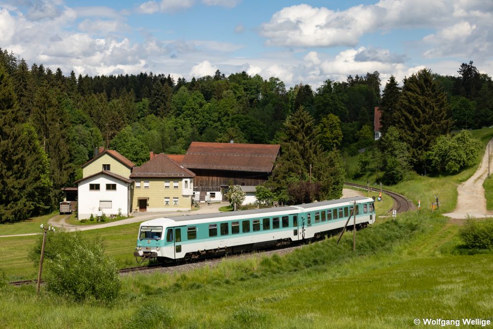 Auf der nur im touristischen Verkehr an Wochenenden betriebenen Ilztalbahn von Passau nach Freyung durch den Bayerischen Wald passiert 628 256, der an die Firma 'MaS Bahnconsult' verkauft wurde und vom neuen Eigentümer seine ursprüngliche Farbgebung zurückerhalten hat, am 18. Mai 2024 als P 81293 den idyllisch gelegenen Weiler Neuhausmühle.