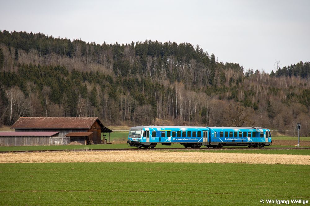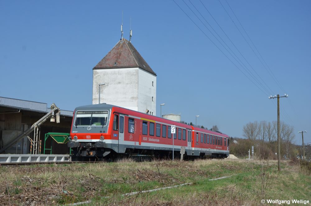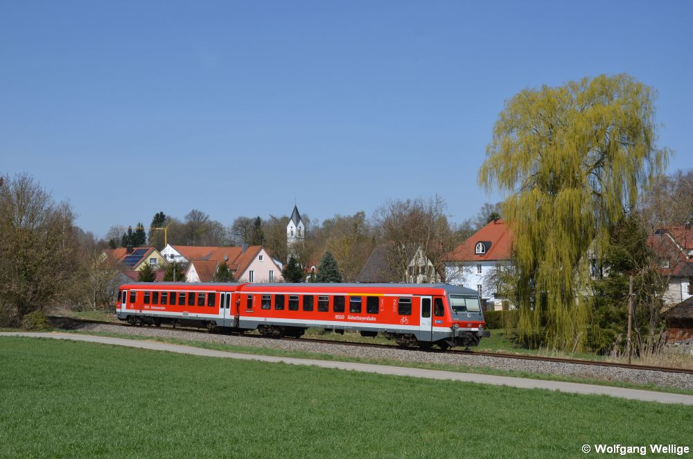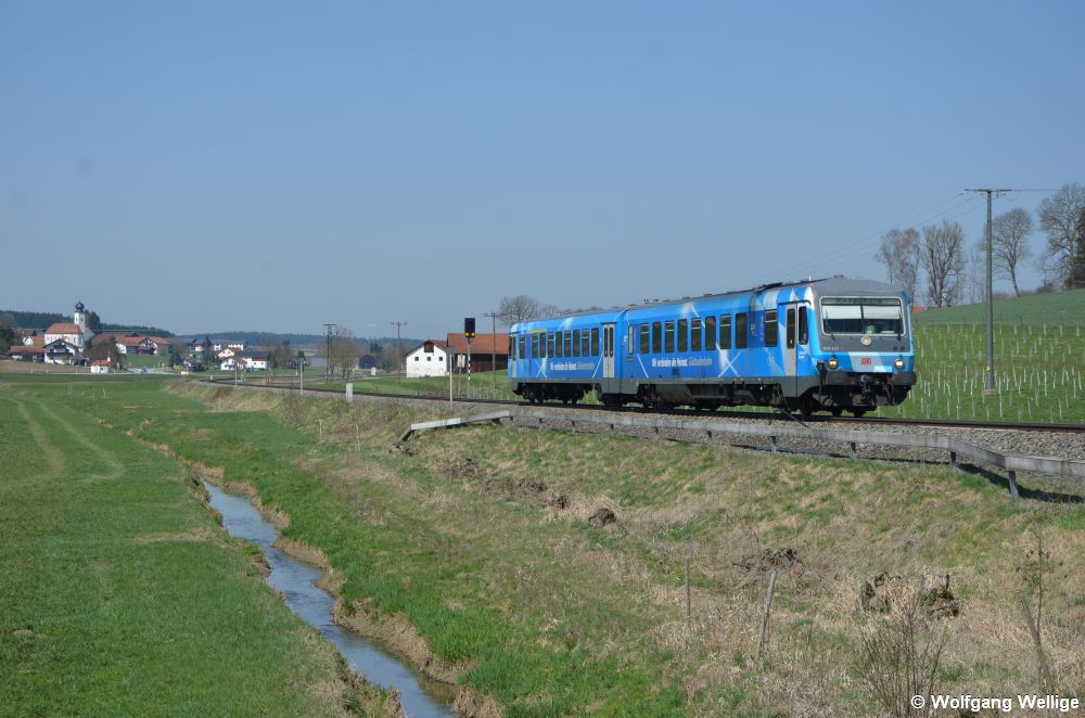 Der mit einer Werbebeklebung für das 'Bahnland Bayern' versehene 628 423 fährt am 8. April 2018 als RB 27143 von Landshut nach Rosenheim, fotografiert bei Neumarkt-Sankt Veit.