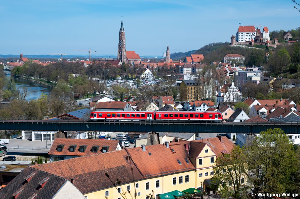 Vor der Kulisse von Bayerns höchstem Kirchturm und der Burg Trausnitz erreicht 628 576 am 12. April 2025 als RB 45 ( Landshut - Mühldorf) in Kürze den Haltepunkt Landshut Süd