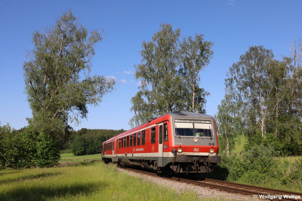 628 646 passiert am 26. Mai 2022 als RB 48 von Wasserburg nach Grafing eine Birkenreihe zwischen Steinhöring und Ebersberg