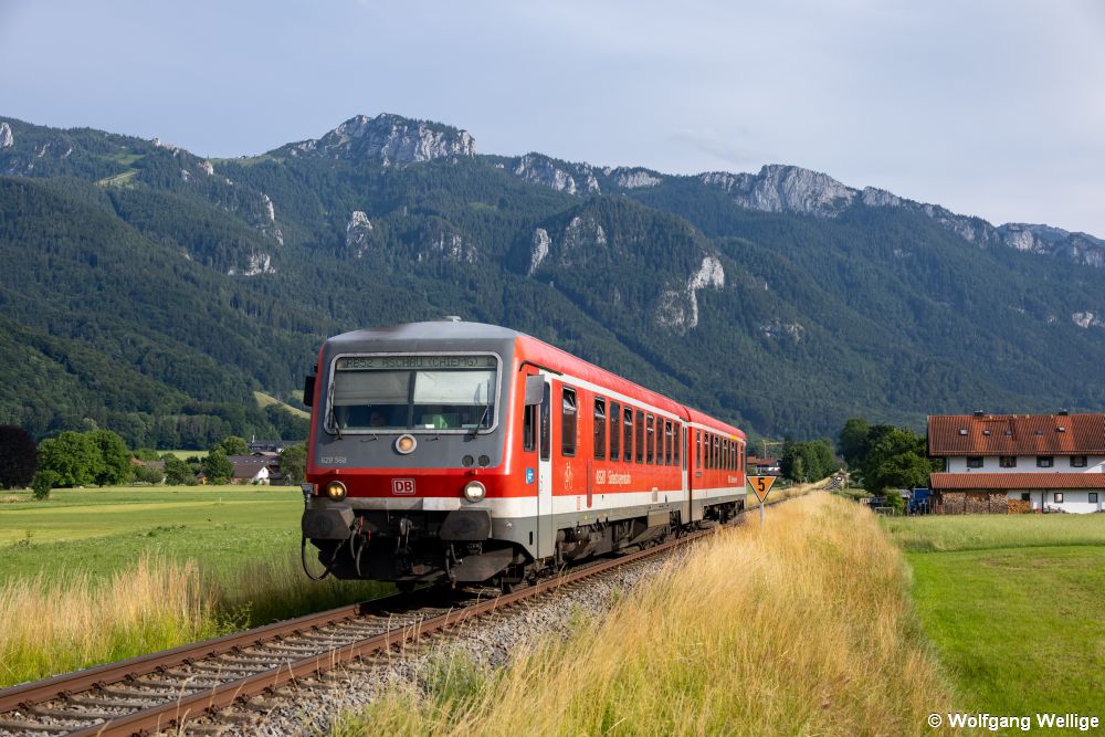 628 568 hat am Abend des 3. Juli 2021 als 'Chiemgau-Bahn' (RB 52) nach Prien am Chiemsee gerade Aschau verlassen, im Hintergrund ist die beeindruckende 1669 Meter hohe Kampenwand zu sehen.