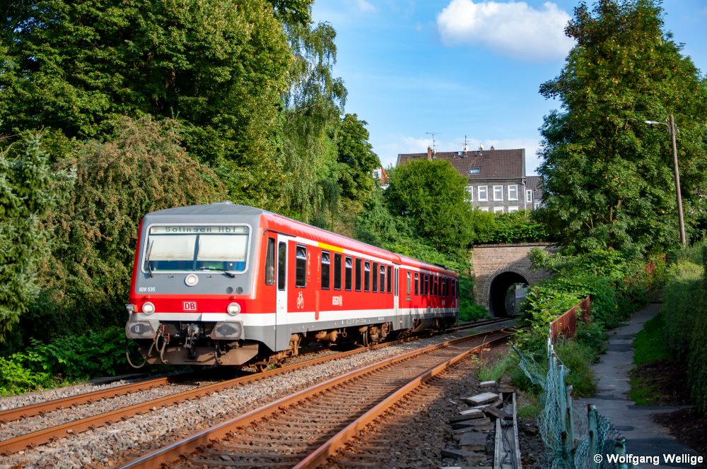 628 535 hat am 09.08.2010 als RB 47 soeben den Weyersberger Tunnel bei Solingen Grünewald durchfahren. Mit 62 Metern Länge ist der Tunnel nur unwesentlich länger als der Zug.