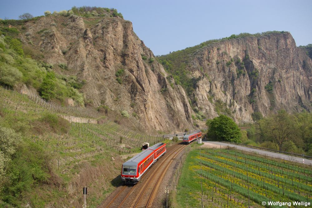 628 490 begegnet am 15. April 2009 auf seiner Fahrt durch das Nahetal als RB 23317 von Mainz nach St. Wendel bei Bad Münster am Stein vor der Kulisse des Rothenfels-Massivs seinem Artgenossen 628 492