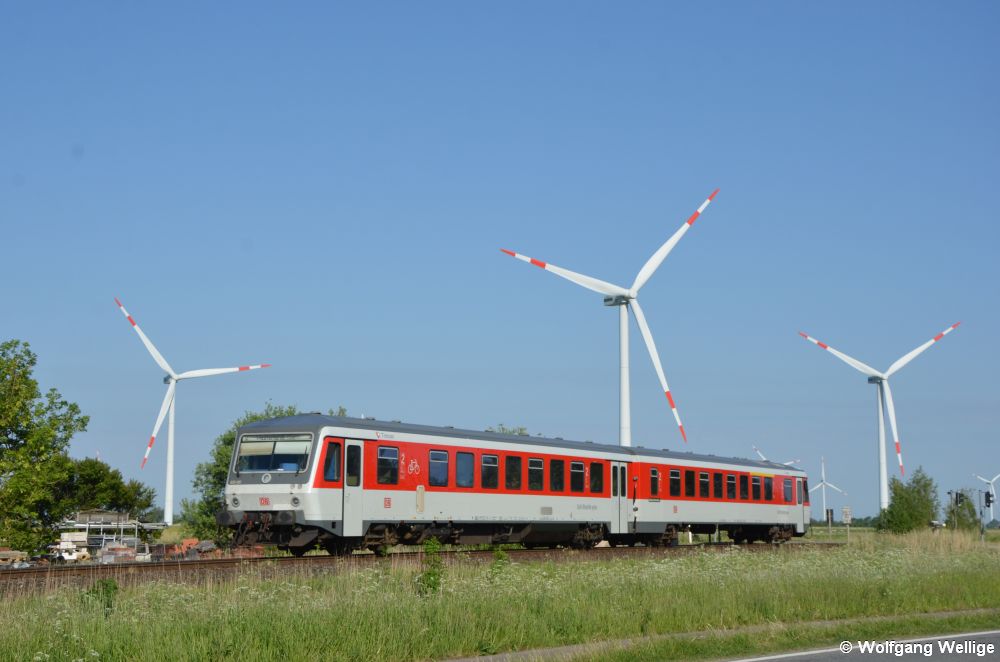 Normalerweise fahren die Triebwagen des 'Sylt Shuttle Plus' nur als Anhängsel des Autozuges an den Windrädern bei Klanxbüll vorbei. Am 22.05.2018 durfte 628 495 jedoch als Vertretung für einen defekten Zug einspringen und als RE 11054 von Niebüll nach Westerland (Sylt) dieseln.