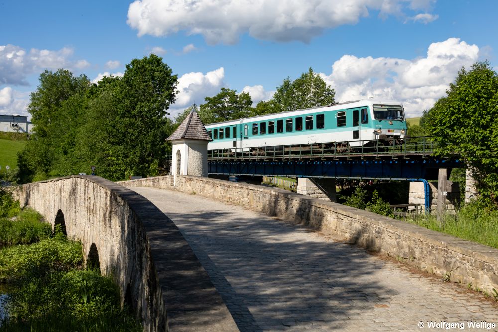 Parallel zur 'Steinernen Brücke' aus dem 16. Jahrhundert überquert 628 256 am 18. Mai 2024 als P 81095 der Ilztalbahn (Freyung - Passau) den Osterbach bei Röhrnbach
