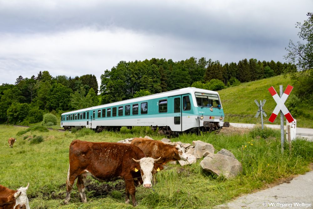 Trotz des vorgeschriebenen Pfeifens vor dem unbeschrankten Bahnübergang lassen sich die Kühe in Köpplmühl bei Röhrnbach überhaupt nicht von der Vorbeifahrt von 628 256 der Ilztalbahn irritieren (18.05.2024)