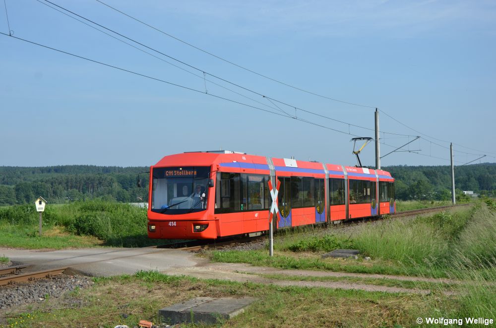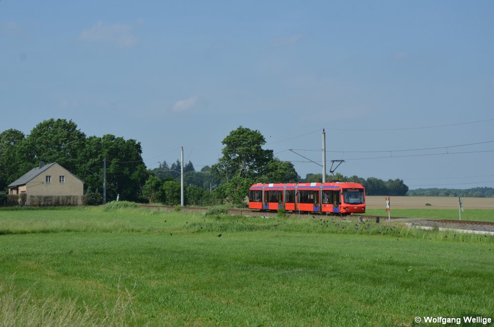 Variobahn 411 der City-Bahn Chemnitz GmbH ist am 28. Mai 2018 auf der für den Betrieb mit Straßenbahnfahrzeugen hergerichteten Eisenbahnstrecke nach Stollberg im Einsatz, aufgenommen nahe des Bahnhofs Pfaffenhain.