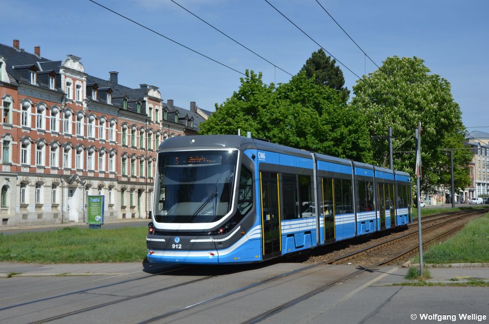 Seit Herbst 2019 sind in Chemnitz die ersten von 14 Fahrzeugen des Typs 'ForCity Classic' (35T) im Einsatz, die vom tschechischen Hersteller Škoda gebaut wurden. Am 8. Mai 2020 fährt Wagen 912 als Linie 5 auf die Haltestelle Nürnberger Straße zu.