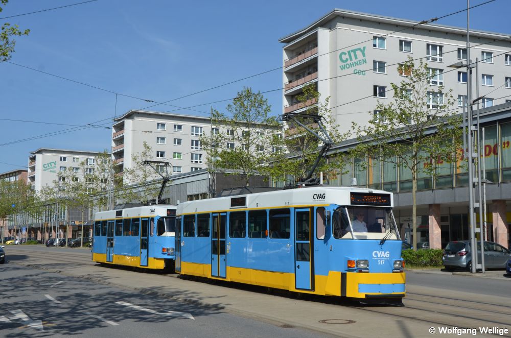 Der 1988 gebaute und schon 1993 modernisierte Tatra T3D Nummer 517 rollt am 5. Mai 2020 die Straße der Nationen zwischen den Haltestellen Theaterplatz und Roter Turm entlang