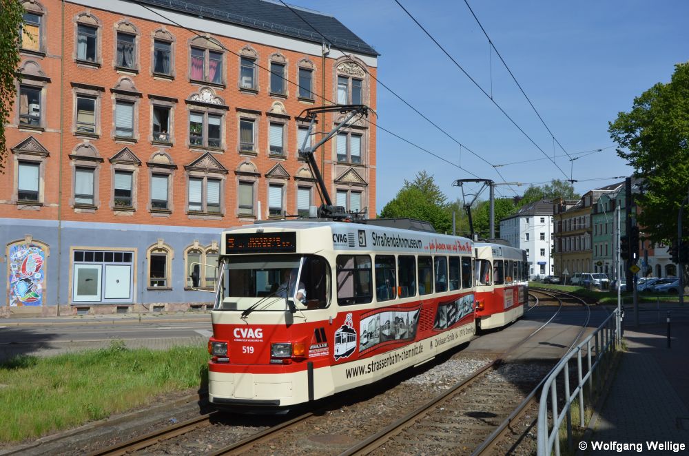 Tatra-Wagen 519 wirbt im Retro-Style für das Chemnitzer Straßenbahnmuseum, aufgenommen am 8. Mai 2020 kurz vor der Haltestelle Tschaikowskistraße.