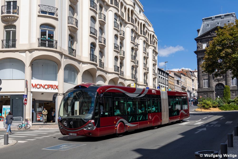 Die Linien B und C werden als so genannter BHNS (Bus à haut niveau de service = Bus mit hohem Servicestandard) betrieben. Am 4.8.2020 ist der speziell für diese Linien angeschaffte Bus 808 im Stadtzentrum von Clermont-Ferrand nahe der Haltestelle Haltestelle Ballainvilliers unterwegs.