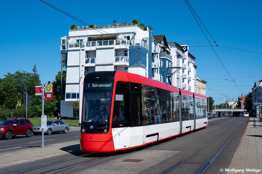 Der 2025 von Škoda gebaute 'ForCity Plus 47T' Nummer 5 fährt am 19. August 2025 auf einer Ausbildungsfahrt in die Haltestelle Görlitzer Straße ein