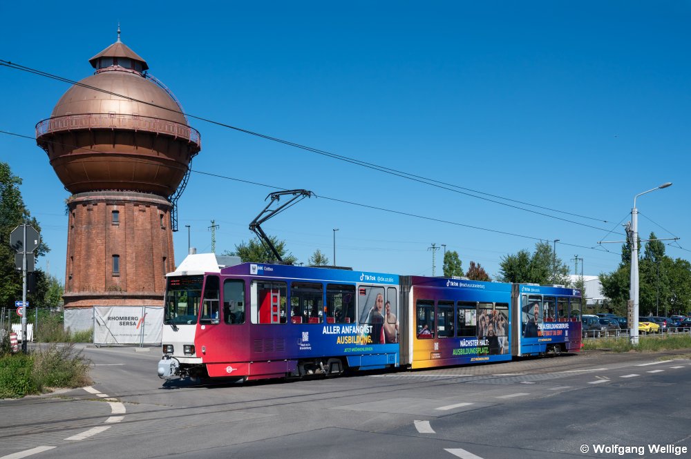 Wagen 109 fährt am 19. August 2025 vor der Station Friedrich-List-Straße am denkmalgeschützten Wasserturm nahe des Cottbuser Hauptbahnhofs entlang, der 1914 für die Versorgung der Damploks gebaut wurde und bis 1955 in Betrieb war.