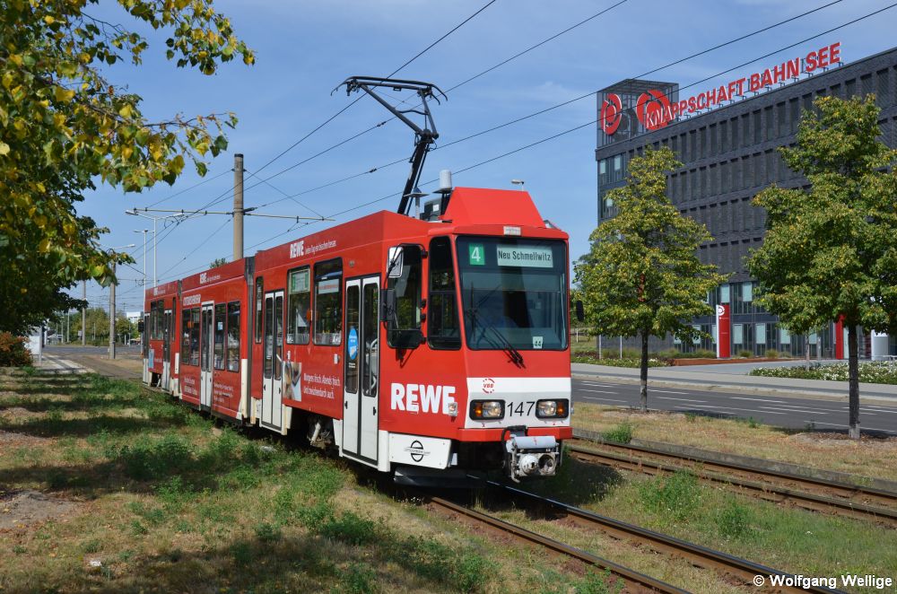 Wie fast alle Cottbuser Wagen des Typs KT4D wurde auch Wagen 147 um ein Niederflur-Mittelteil ergänzt und damit zu einem KTNF6. Hier fährt er am 12.09.2023 auf die Haltestelle Schillerstraße zu.