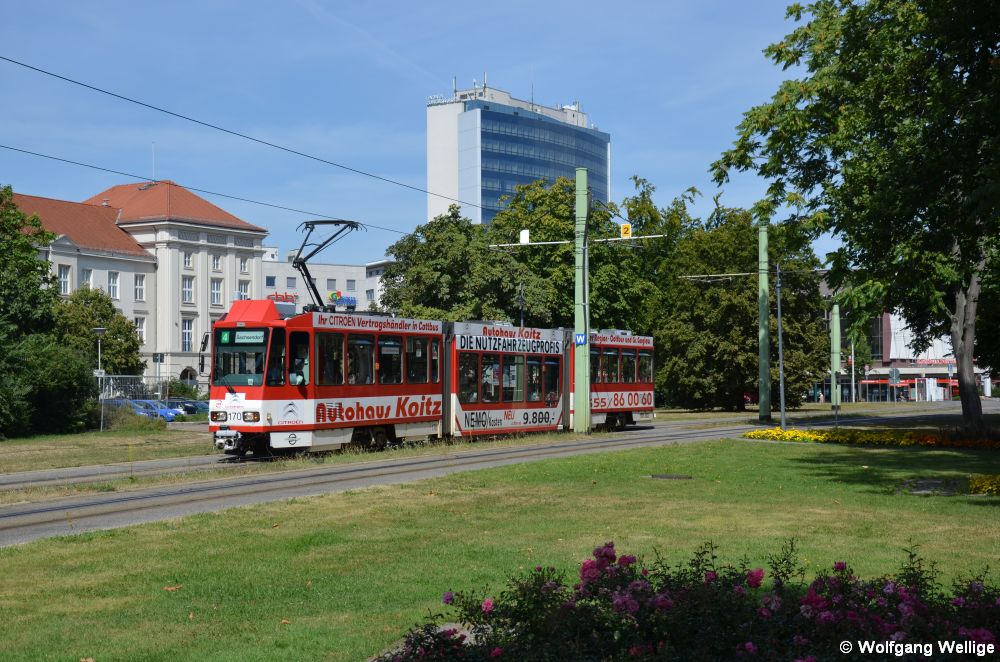 Wagen 170 erreicht auf der Linie 4 Richtung Sachsendorf gleich die Haltestelle Stadtpromenade (18.08.2012)