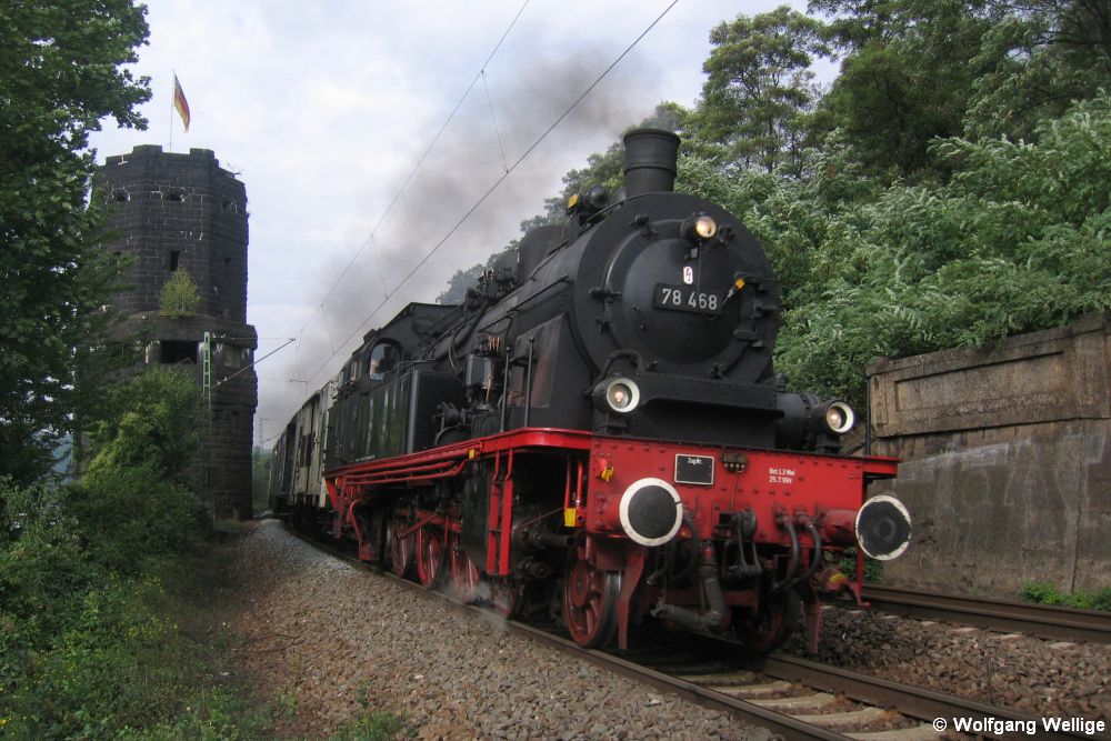 78 468 passiert am 23.09.2006 im Rahmen einer Sonderfahrt die Ruine des Brückenkopfes der ehemaligen Brücke von Remagen kurz hinter Erpel