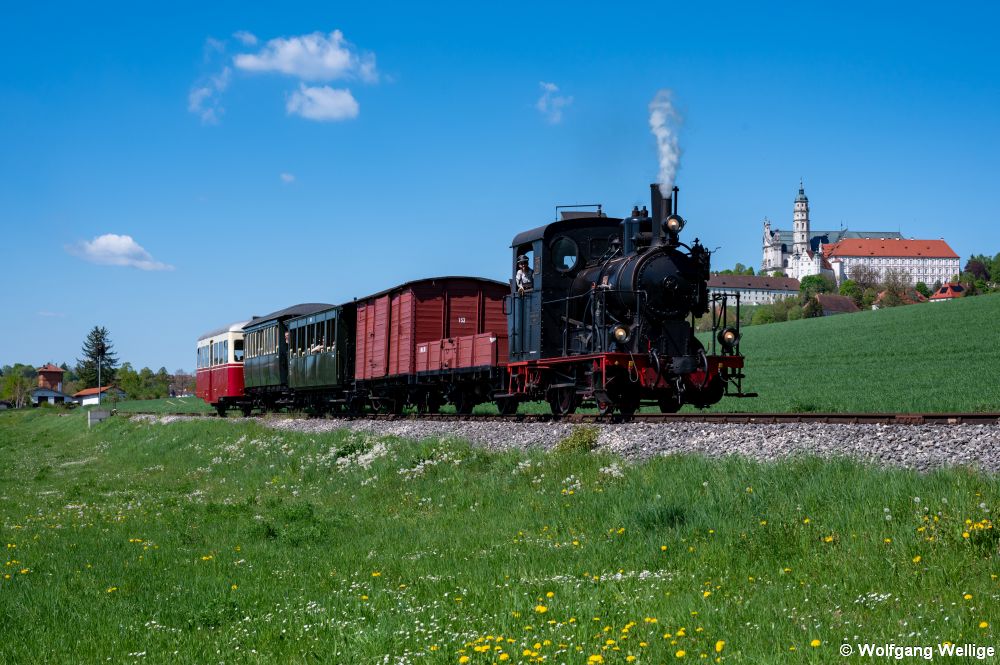 Die zweiachsige Dampflok WN12 der Härtsfeld-Museumsbahn ist am Maifeiertag 2025 gerade mit Zug P 5 in Neresheim zur Fahrt nach Katzenstein aufgebrochen, rechts ist das Kloster Neresheim zu sehen.
