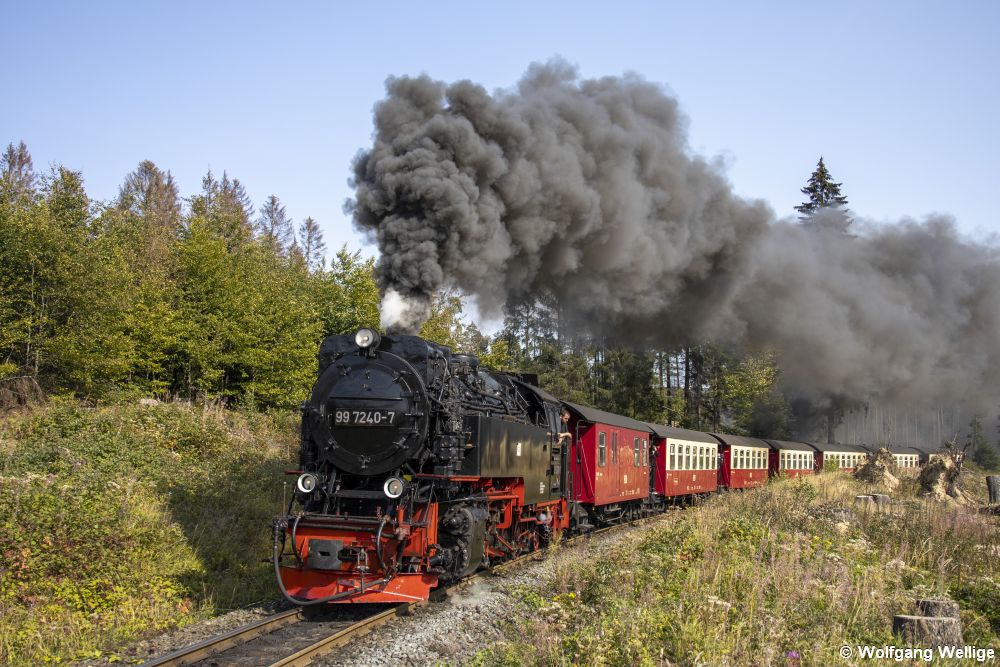 Mit Volldampf nimmt 99 7240 der Harzer Schmalspurbahnen (HSB) den Anstieg hinauf zum Brocken in Angriff, aufgenommen zwischen Drei Annen Hohne und Schierke. (11.09.2020)