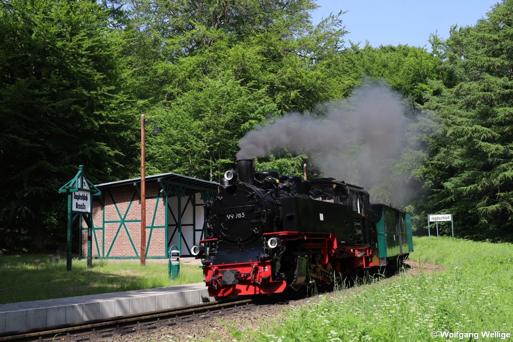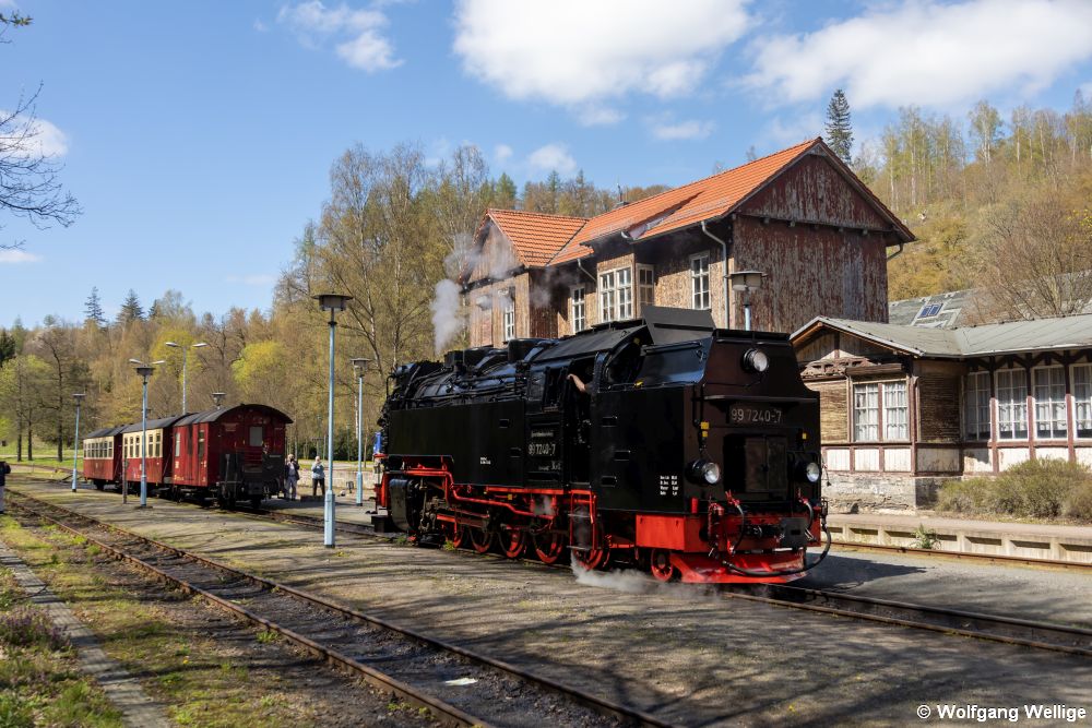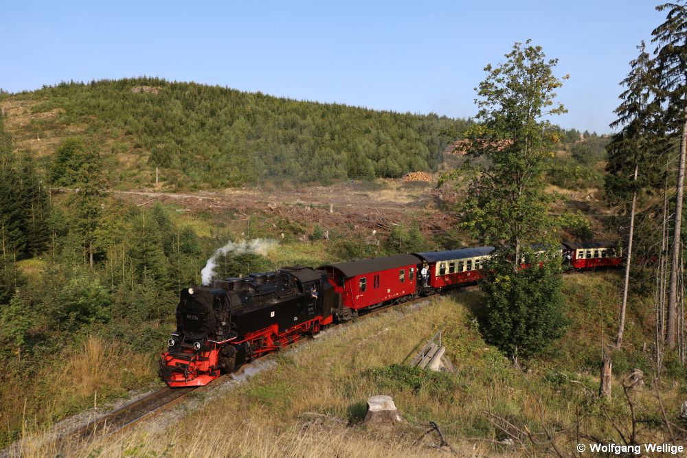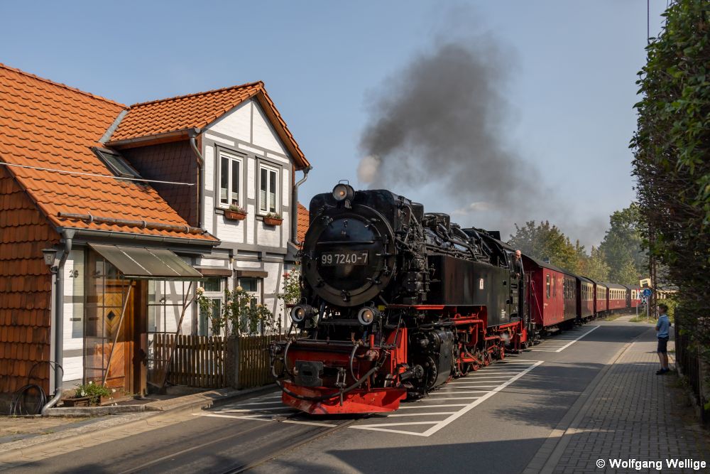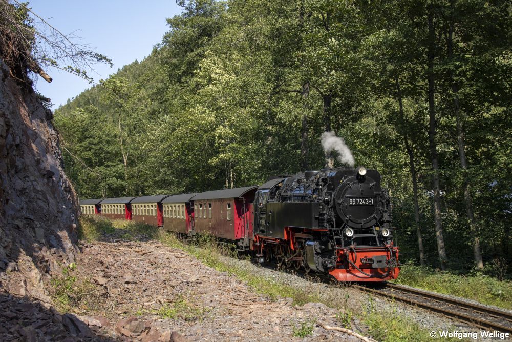 99 7243 bespannt am 11.09.2020 einen der zwei täglichen Dampfzüge auf der Harzquerbahn. Der von Wernigerode kommende Zug 8903 erreicht in wenigen Minuten seinen Endbahnhof Eisfelder Talmühle, wo er die Fahrgäste Richtung Nordhausen an den von der Selketalbahn kommenden Triebwagen übergibt.