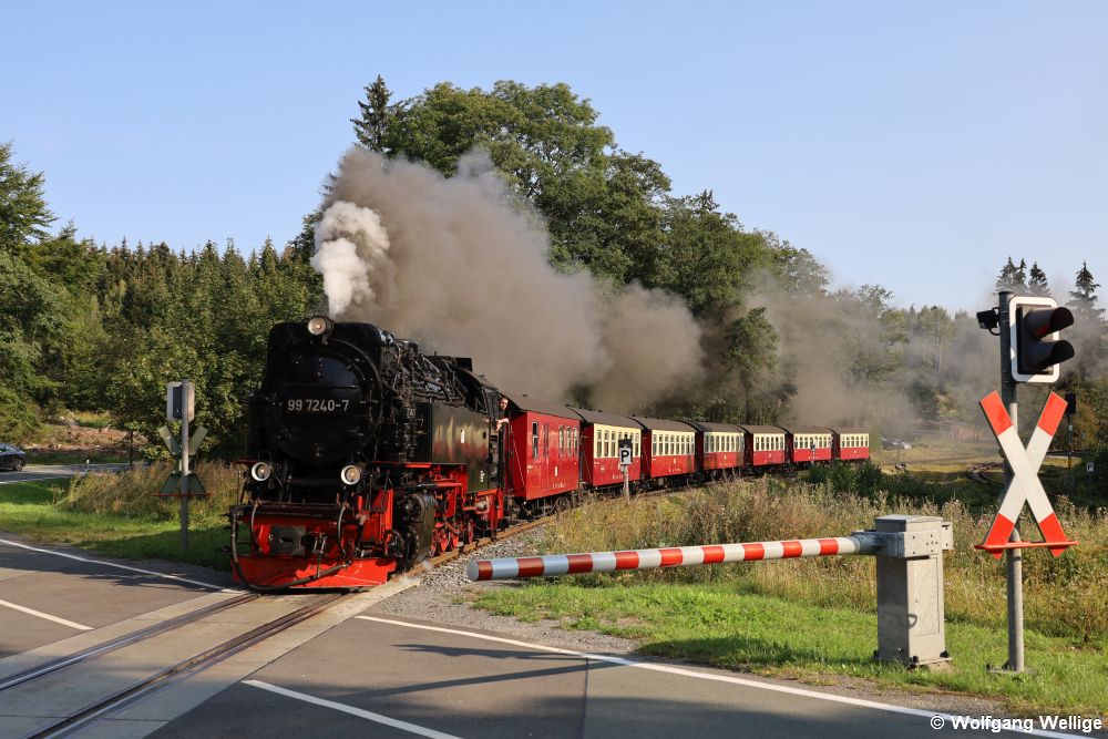 99 7240 der Harzer Schmalspurbahnen passiert am 11. September 2020 auf ihrer Fahrt von Wernigerode zum Brocken den Bahnübergang kurz hinter dem Bahnhof Drei Annen Hohne
