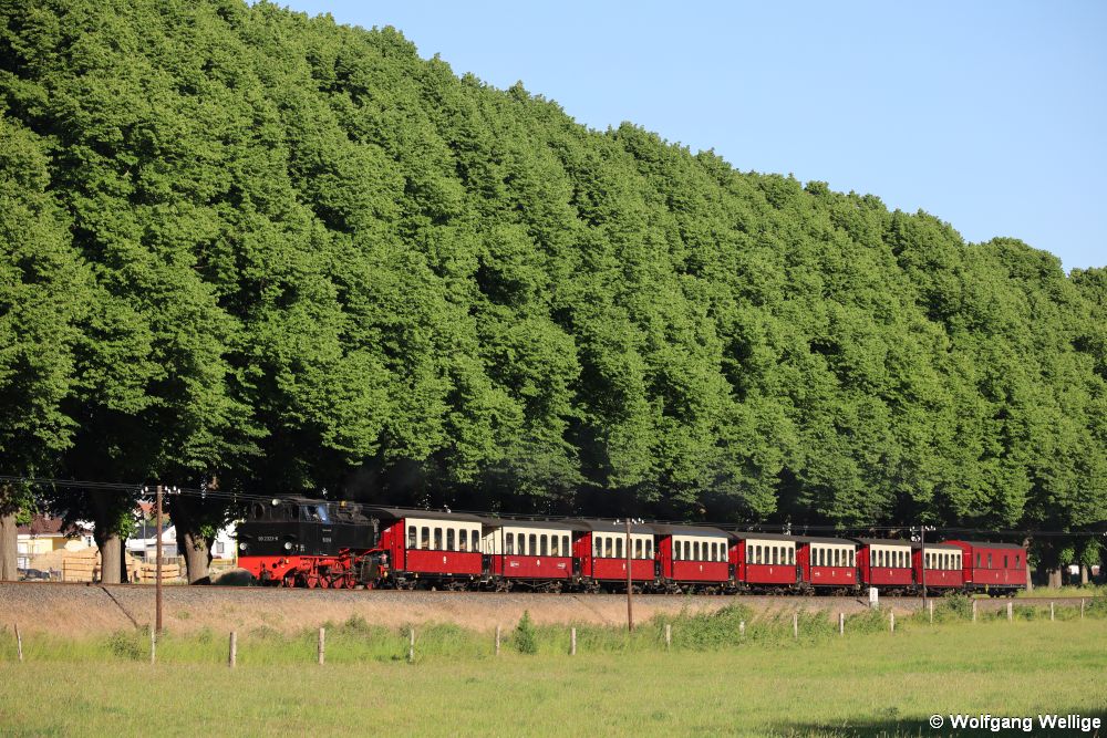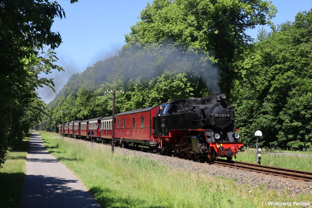 99 2323 dampft am Abend des 15. Juni 2020 entlang der Allee von Bad Doberan nach Heiligendamm Richtung Kühlungsborn