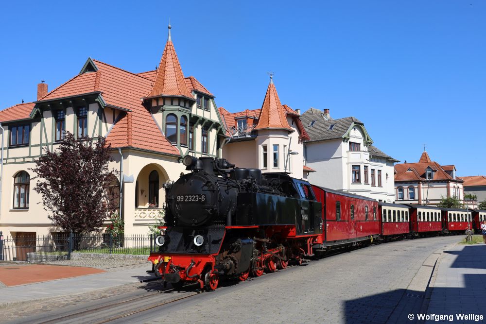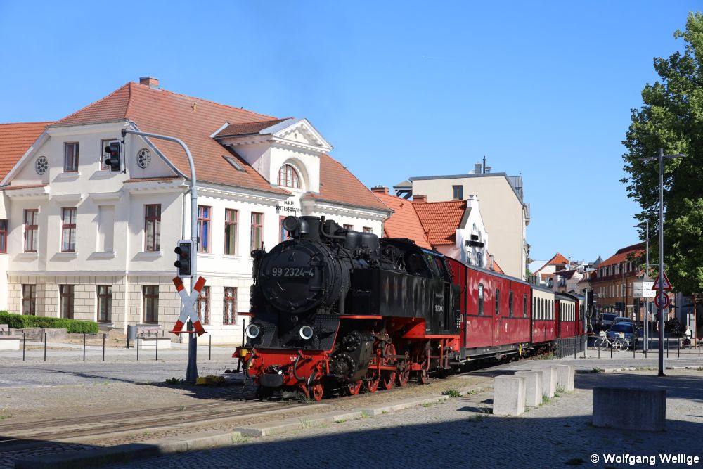 99 2324 rollt am 15.06.2020 durch die Innenstadt von Bad Doberan und kommt gleich am Bahnhof an, wo die Strecke der Schmalspurbahn 'Molli' endet und zu den Zügen nach Rostock und Wismar umgestiegen werden kann.