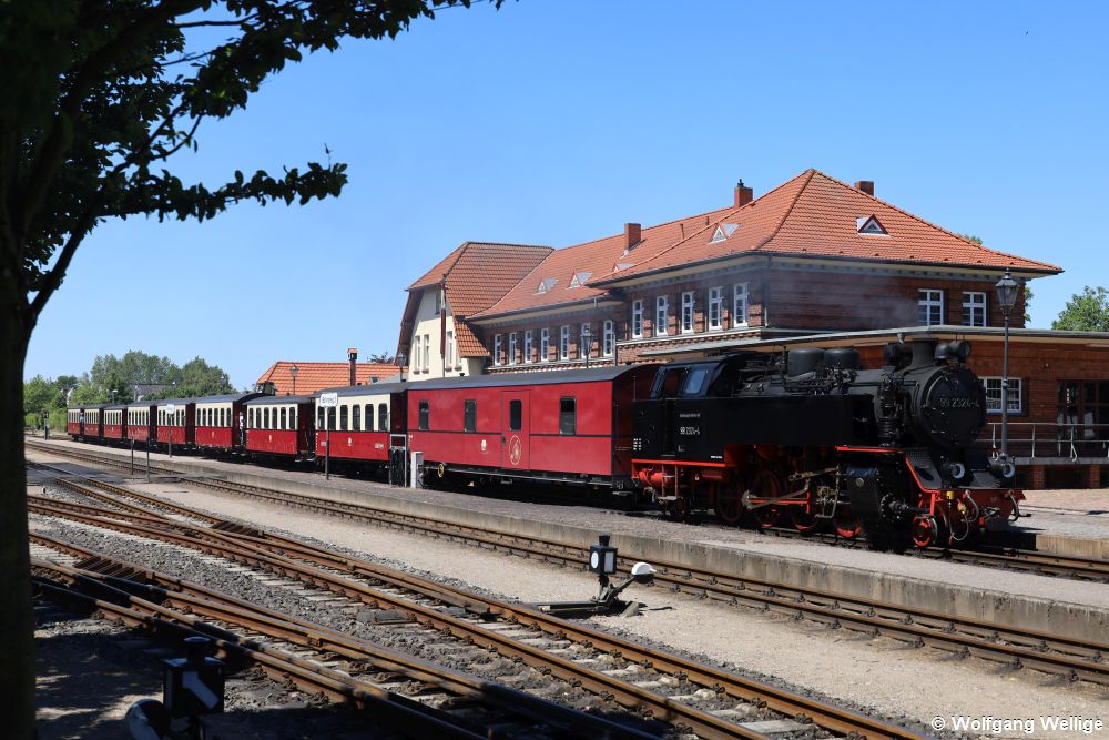 99 2324 des 'Molli' steht am 15. Juni 2020 abfahrbereit im Bahnhof Ostseebad Kühlungsborn West zur Fahrt als Zug 14621 nach Bad Doberan