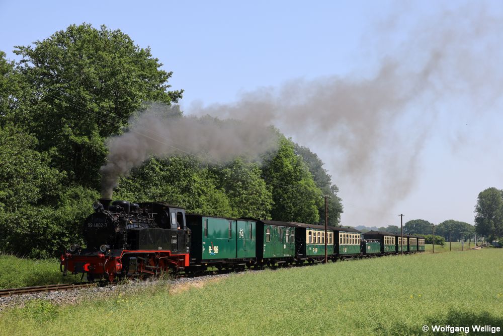 99 4802 der Rügenschen Bäderbahn 'Rasender Roland' dampft am 13. Juni 2020 bei Beuchow als P 104 von Göhren nach Lauterbach Mole