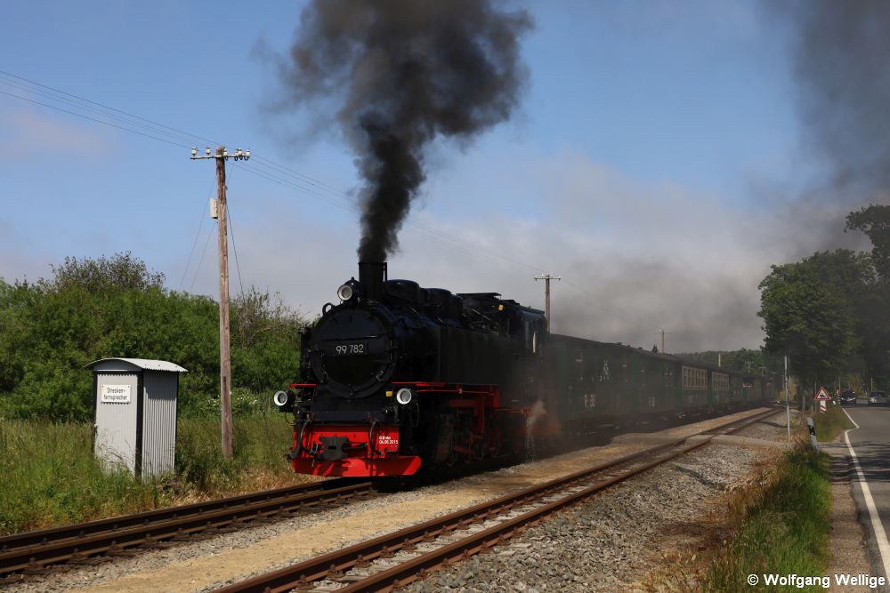 Lok 99 782 des 'Rasenden Rolands' passiert als Zug P 106 auf dem Weg von Göhren (Rügen) nach Lauterbach Mole die zweigleisige Ausweichstelle bei Posewald (13.06.2020)