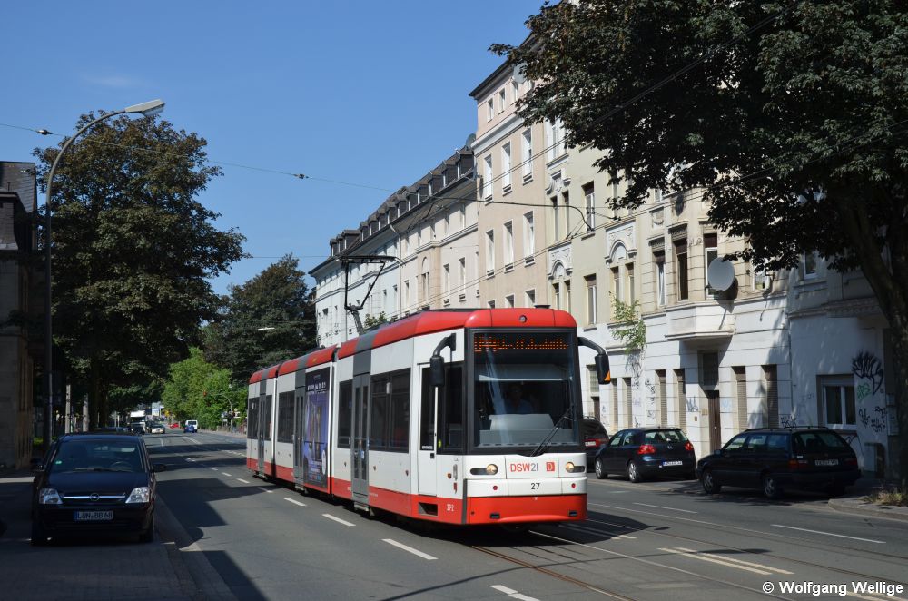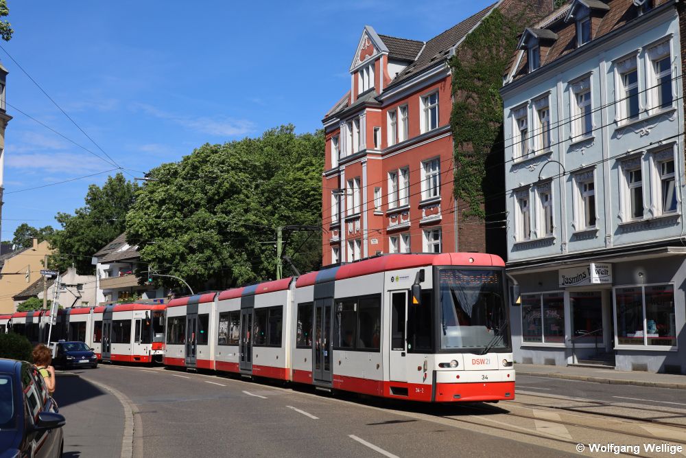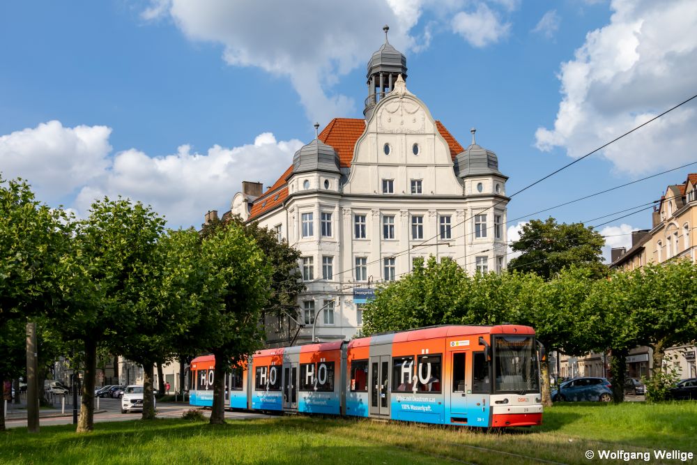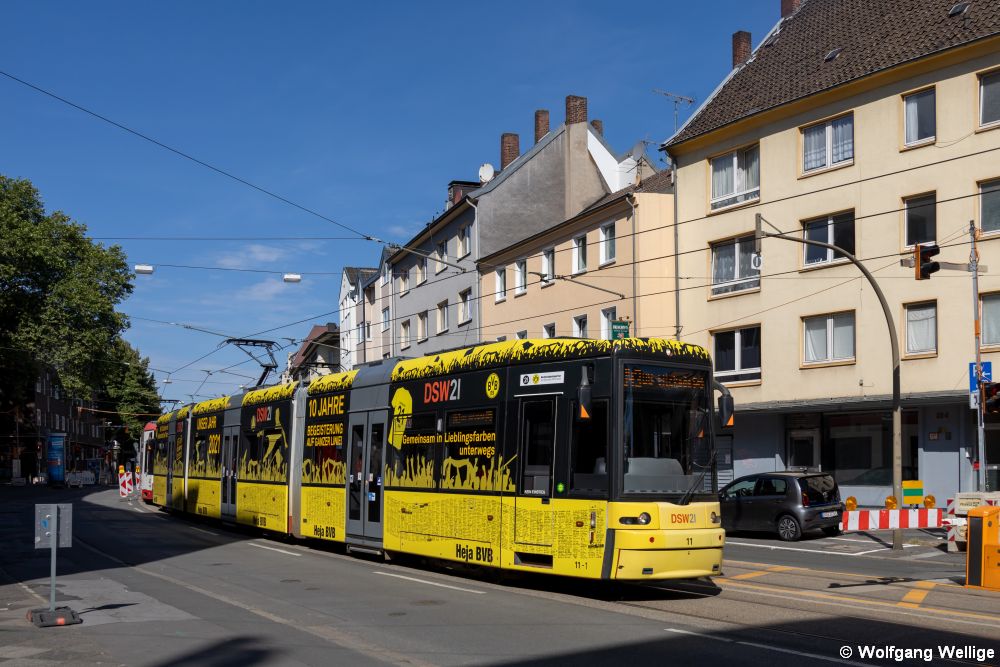 Mit der Aufschrift 'H2Ö' wirbt Wagen 29 für die Verwendung von durch Wasserkraft gewonnenem Strom im öffentlichen Nahverkehr. Am 17.07.2024 überquert er gerade den Borsigplatz, der auch Fans des örtlichen Fußballvereins ein Begriff ist.