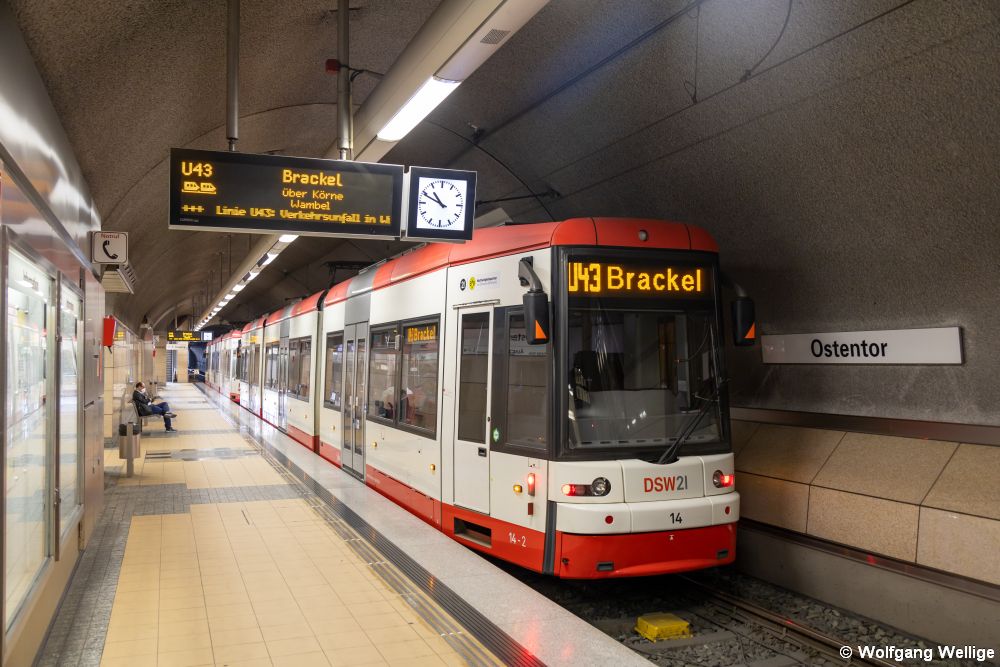 Die beiden Niederflur-Linien U43/U44 haben in der Innenstadt ein paar unterirdische Haltestellen. Eine davon ist Ostentor, aufgenommen am 28. Juli 2022 mit 'Flexity' Nummer 14.