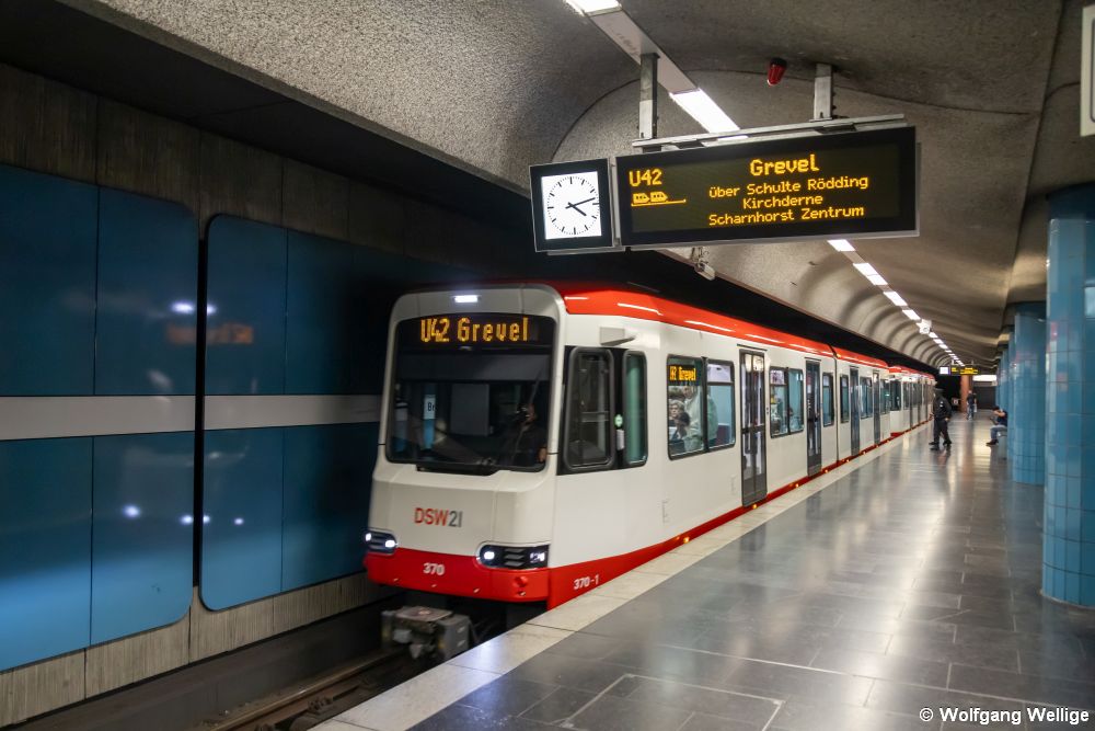 Erst seit wenigen Wochen im Einsatz ist am 17. Juli 2024 der von der Leipziger Firma HeiterBlick gebaute 'Vamos B80D' Nummer 371, der auf der Linie U42 gerade den Dortmunder Stadtteil Kirchderne Richtung Innenstadt verlässt.