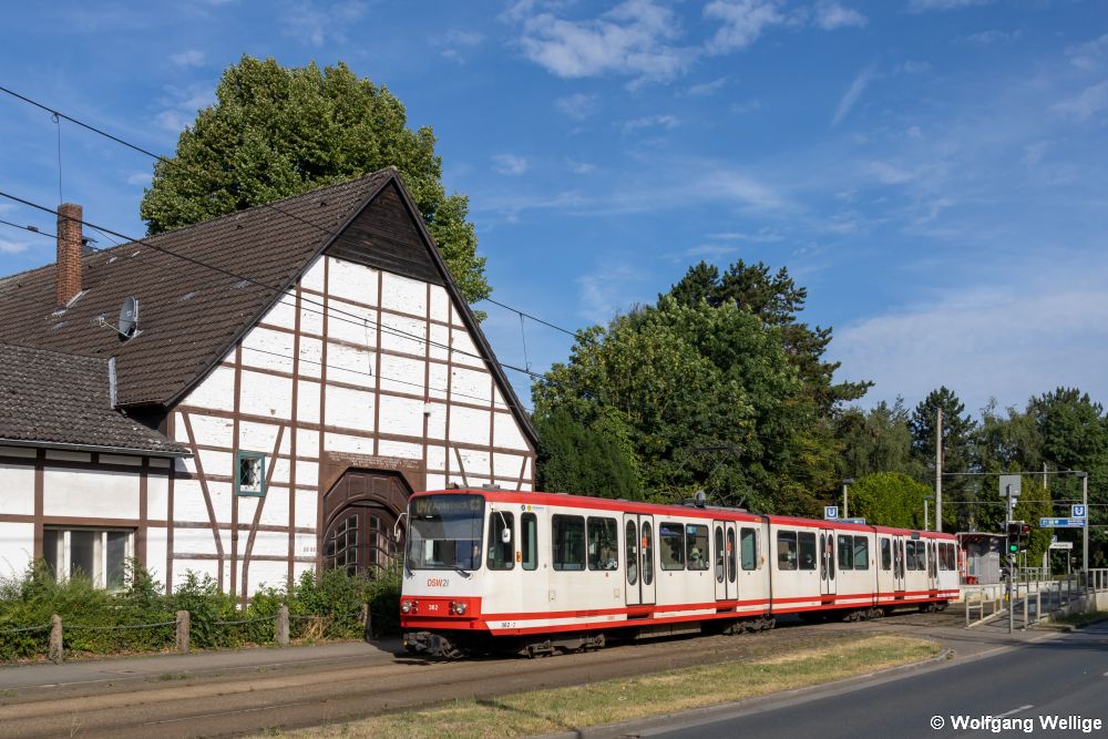 Einer der letztgebauten 'B-Wagen' ist der im Jahre 1999 gelieferte, achtachsige Wagen 362. Am 28.07.2022 passiert er auf dem geradezu dörflich wirkenden Streckenabschnitt durch Aplerbeck einen alten Hof hinter der Haltestelle Schürbankstraße.