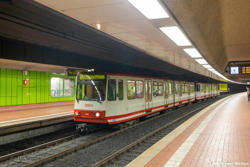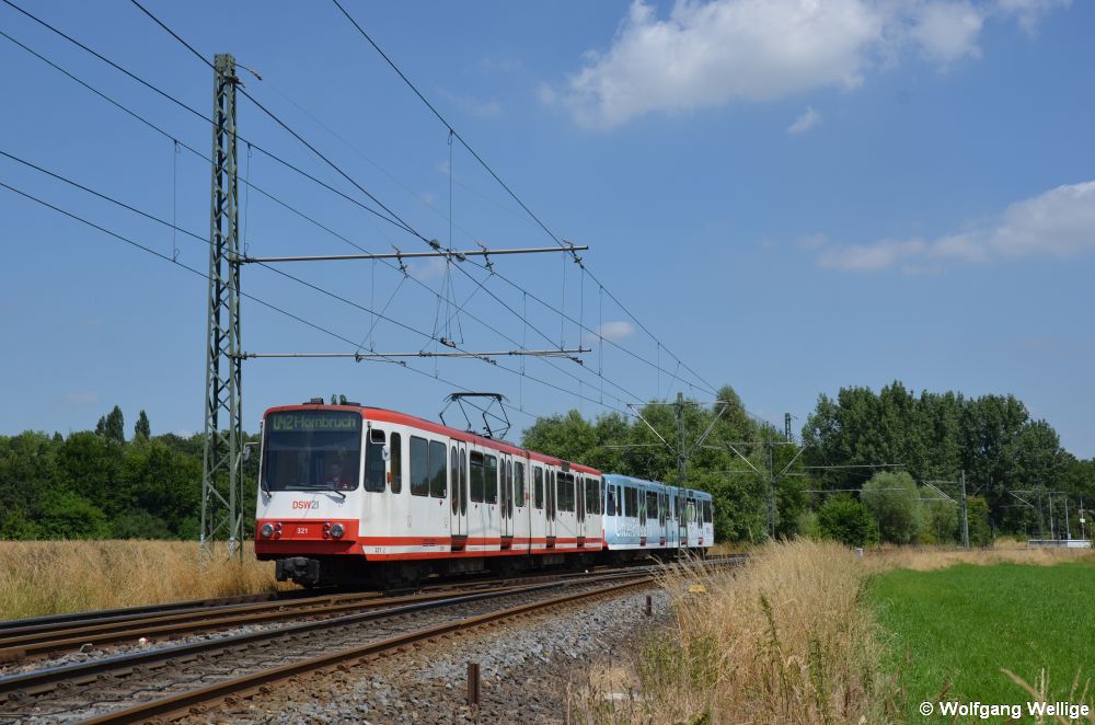 Der 1991 gebaute 'B-Wagen' 321 vom Typ Duewag B6 ist am 18. Juli 2013 als Linie U42 gerade in Grevel gestartet
