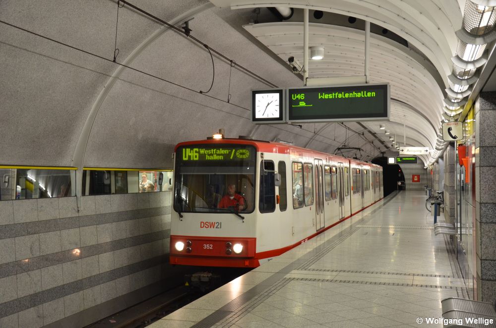 Im Jahre 2006 hießen die Linien U43 und U44 noch 403 und 404 und durchquerten die Innenstadt oberirdisch: Am 11.09.2006 ist der noch im alten Farbdesign lackierte Wagen 119 nahe der Haltestelle Kampstraße unterwegs Richtung Marten.