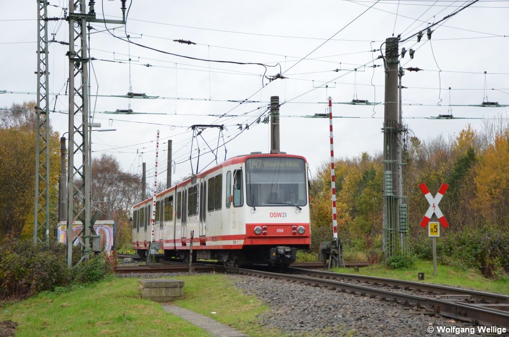 Die beschrankte Gleiskreuzung der Stadtbahn mit einer zweigleisigen Hauptstrecke der Deutschen Bahn ist eine Besonderheit des Dortmunder Stadtbahnnetzes. Am 06.11.2015 befährt Wagen 359 als U47 diesen 'Bahnübergang' bei Obernette.