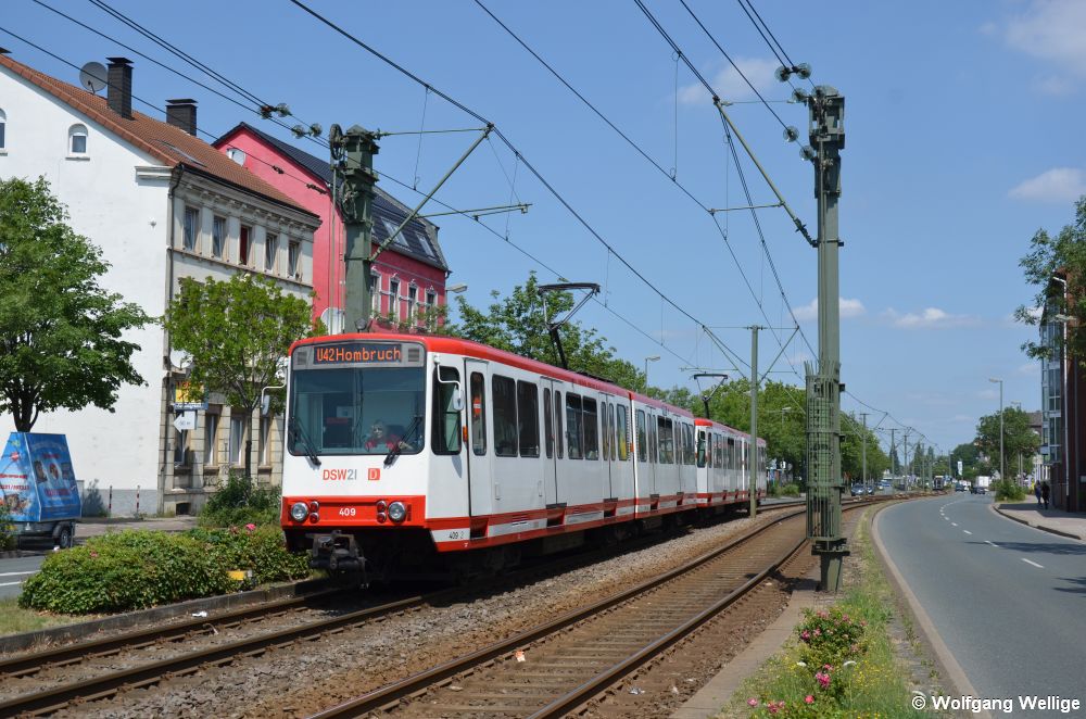 Einer von zwölf gebraucht aus Bonn übernommenen Stadtbahnwagen B ist Wagen 409 (ex-Bonn 4751), die nur auf der Stadtbahnlinie U42 eingesetzt werden, hier am 18. Juli 2013 kurz vor der Haltestelle Glückaufstraße.