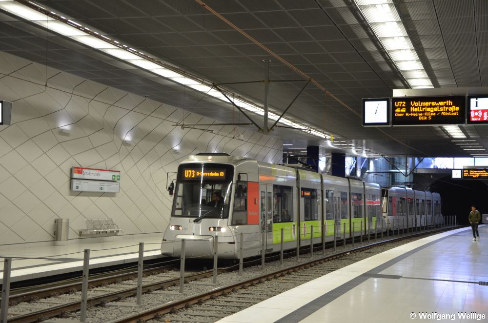 Die Station Schwadowstraße ist Bestandteil des im Februar 2016 eröffneten Wehrhahn-Tunnels, die Aufnahme mit Wagen 3322 entstand am 9. Oktober 2016