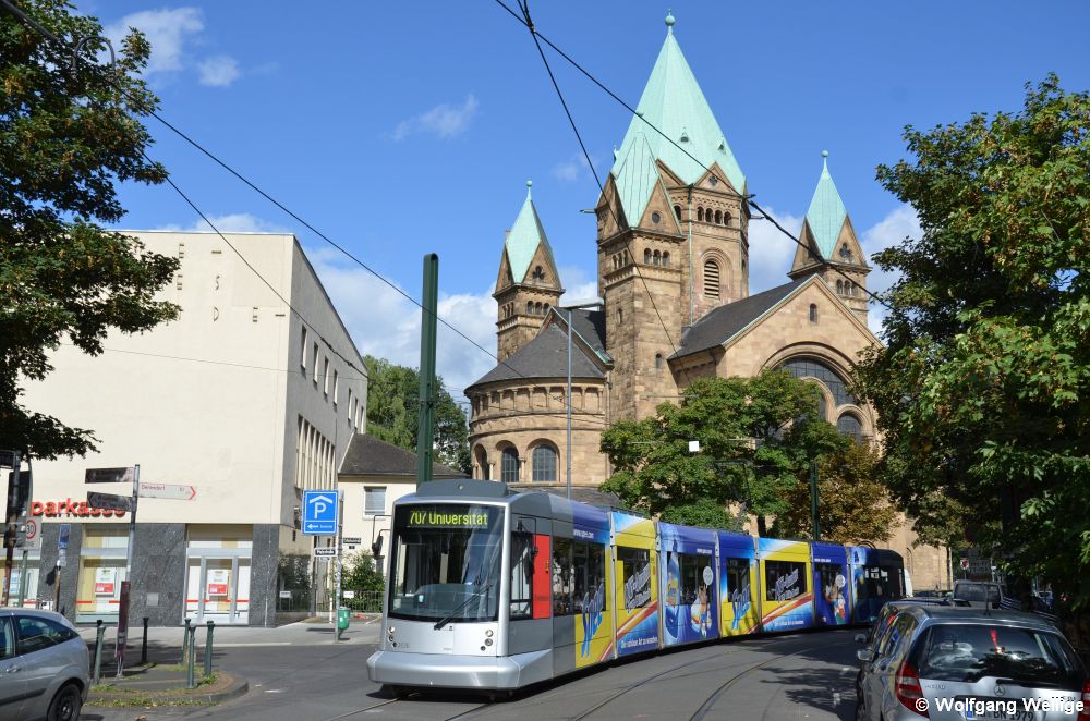 Wagen 2036 vom Typ NF10 erreicht am 15. September 2013 als Linie 707 zur Universität gleich die Haltestelle Dreieck, im Hintergrund ist die Kreuzkirche zu sehen.
