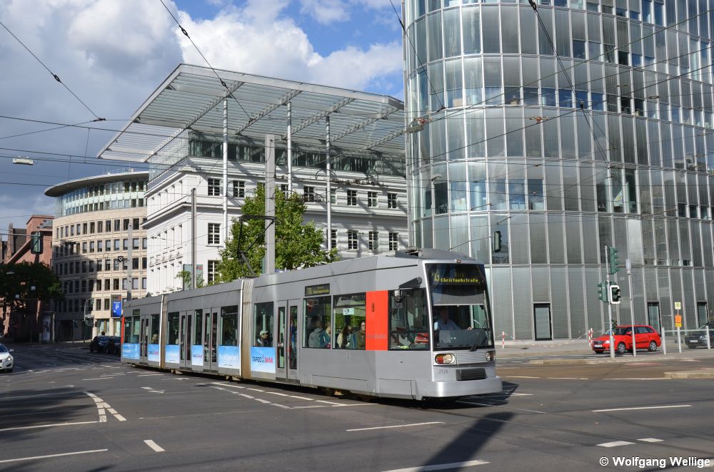 Düsseldorfs erste Niederflurgeneration waren in den 1990er-Jahren die NF6-Wagen. Wagen 2128 dieses Typs hält am 16.09.2013 als Linie 719 gleich am Graf-Adolf-Platz.
