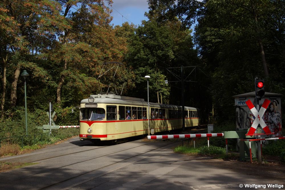 Der inzwischen ausgemusterte Düwag-GT8 Nummer 2672 passiert am 25. September 2009 als Linie 712 den beschrankten Bahnübergang hinter der Haltestelle Rather Waldstadion. Der Wagen wurde nach seiner Ausmusterung nach Posen (Polen) verkauft.